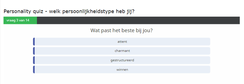 Drag-and-drop, plaats-in-de-goede-volgorde, fill-in-the-blanks en nog veel meer interactieve oefenvragen, tot een persoonlijkheidtest aan toe.